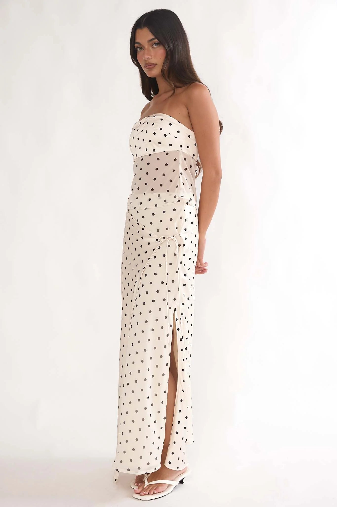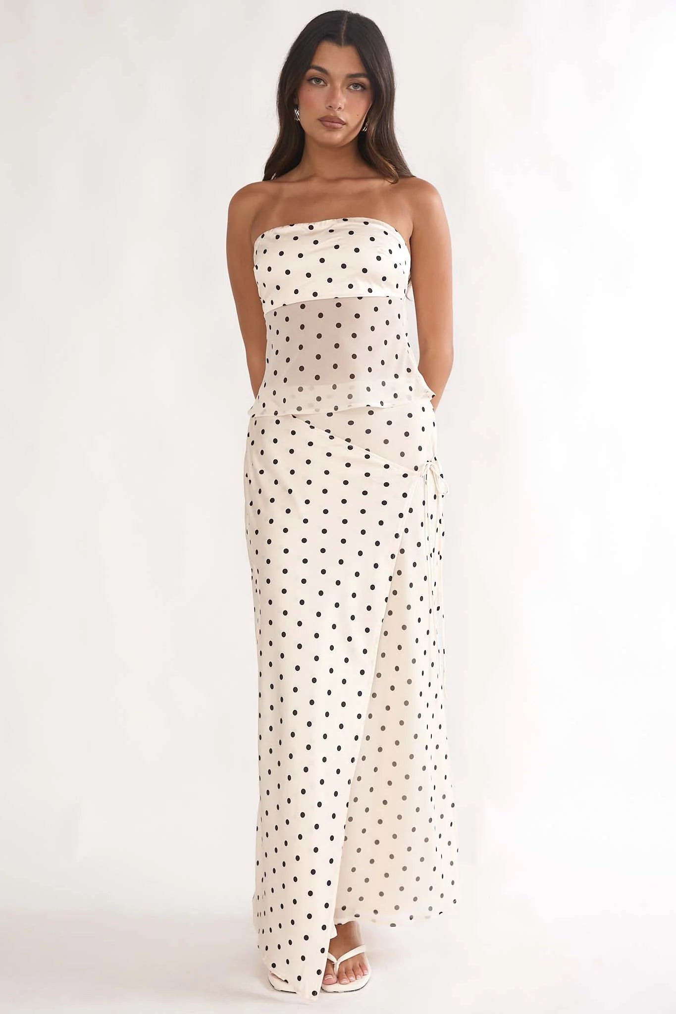 This stylish set features a sleek strapless bandeau top paired with a flowing maxi skirt, creating a flattering and feminine silhouette. The soft ivory fabric with delicate black polka dots brings a timeless charm while keeping the look fresh and playful.
