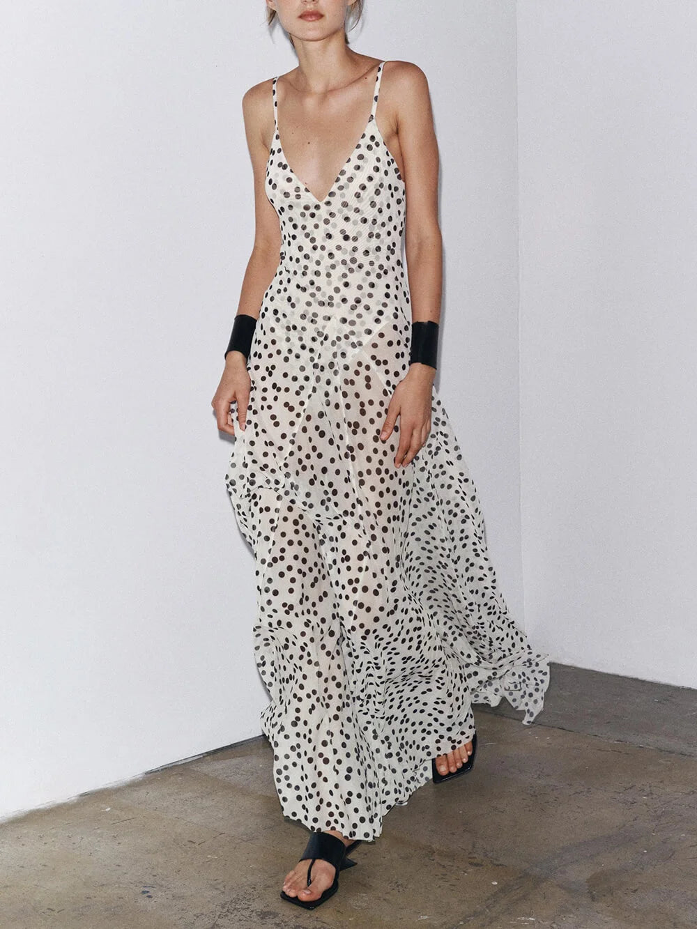 Effortlessly elegant with a touch of modern allure — the Elara Polka Maxi Dress by Stareoutfit is designed for women who love timeless silhouettes with graceful movement. Featuring delicate spaghetti straps and a flattering deep V-neckline, this dress beautifully enhances the natural shape while maintaining a soft, feminine charm.