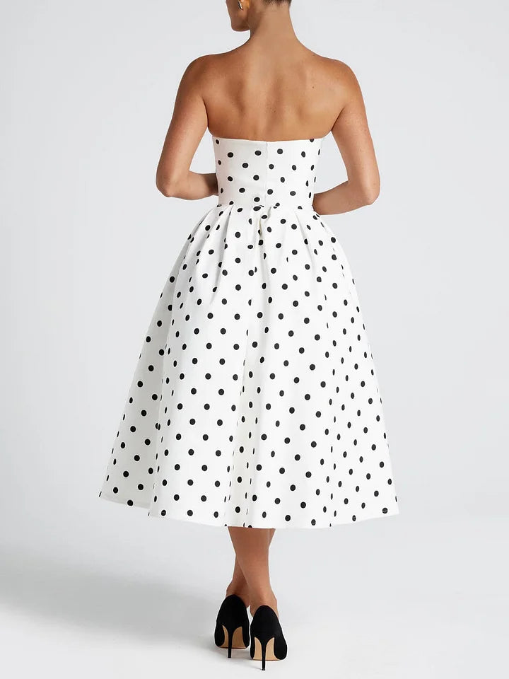 Design: Strapless neckline with bold polka dot pattern