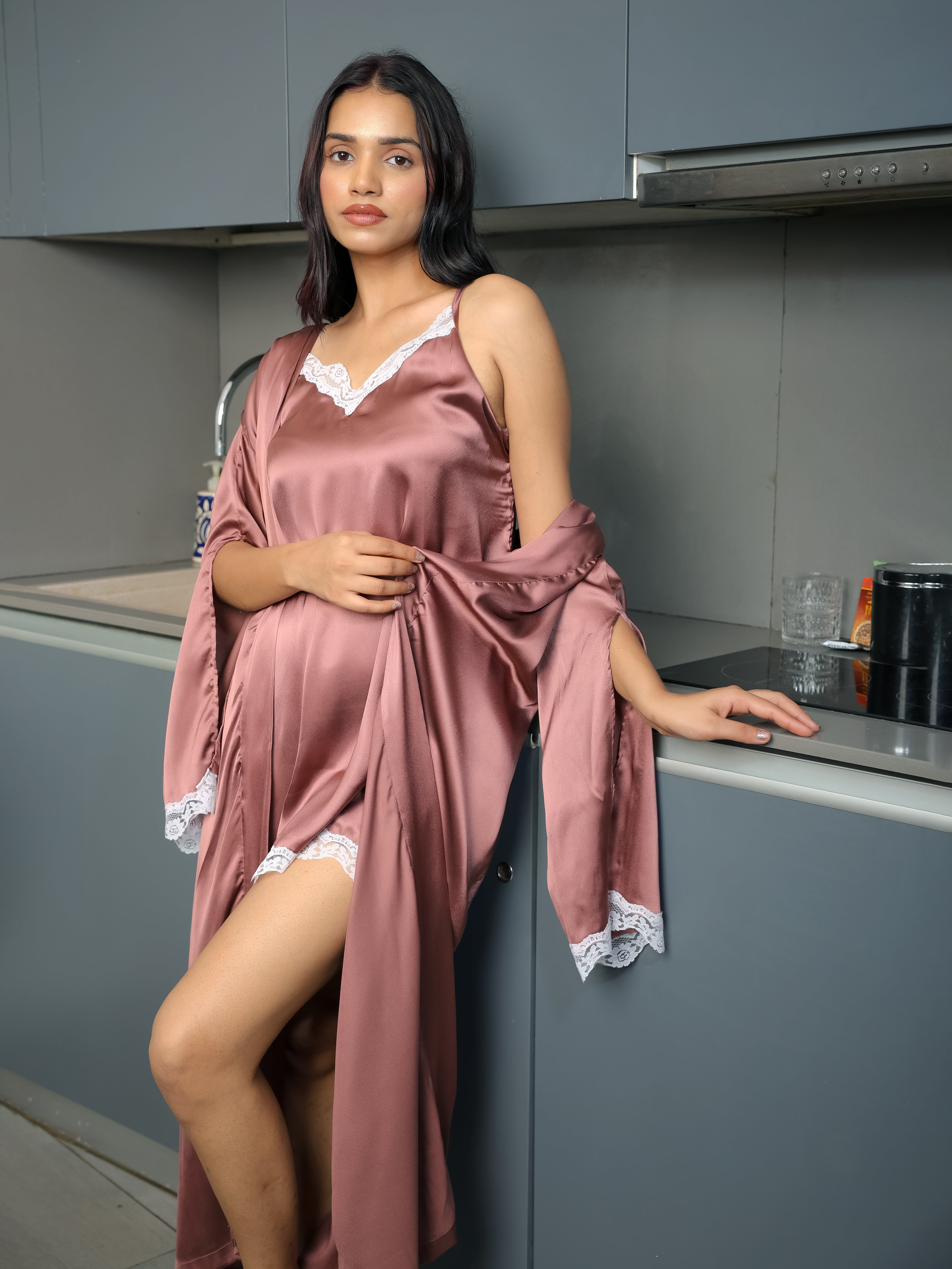 2-piece satin nightwear set – includes a lace-trimmed slip dress and a matching long shrug with a subtle tie-up belt detail.