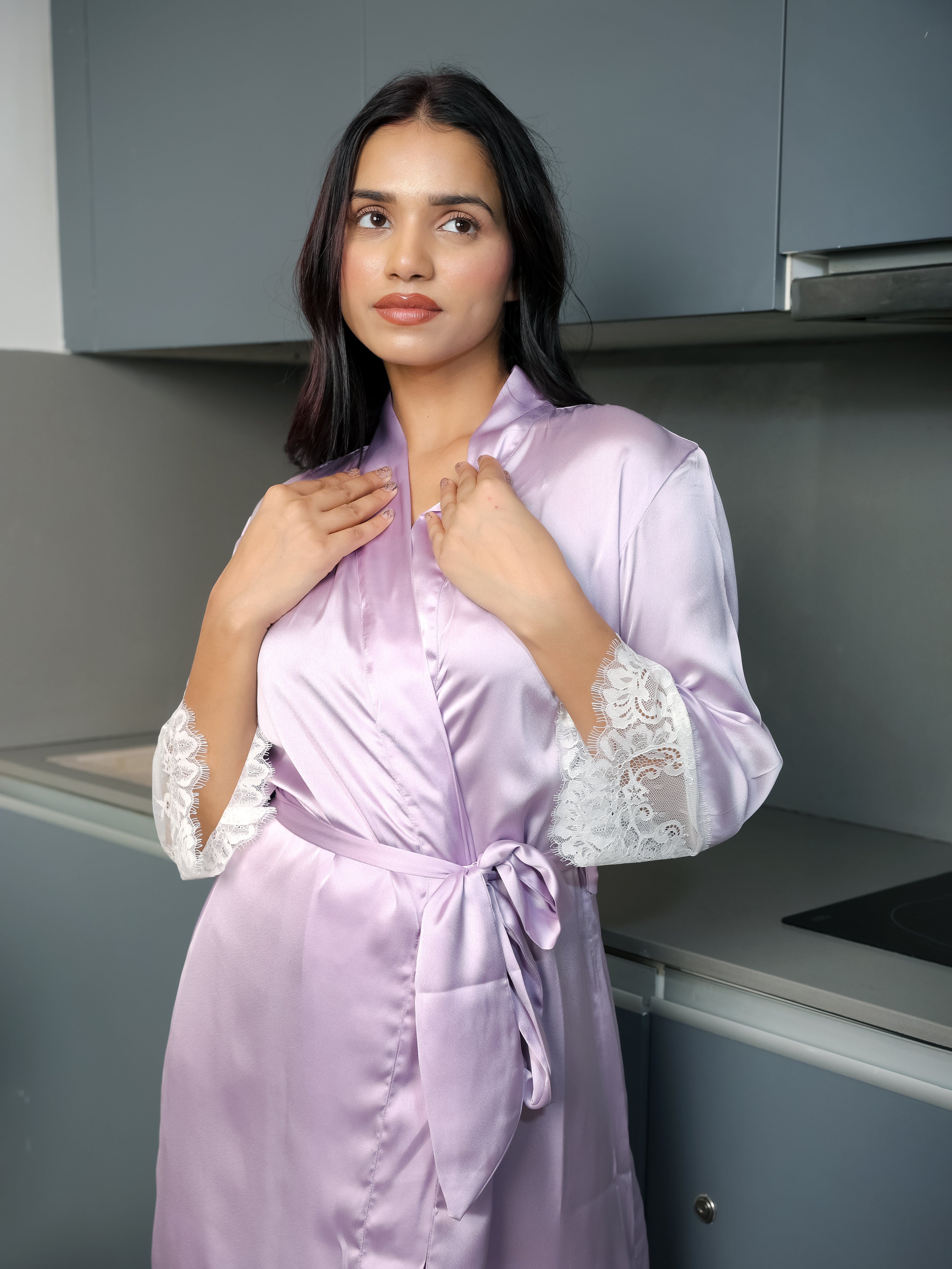 The Royal Amethyst Lace Satin Robe redefines sophistication with its majestic purple hue and lustrous satin finish. The fine lace detailing enhances its romantic charm, while the smooth texture provides effortless comfort. Lightweight, elegant, and irresistibly soft — it’s designed for the woman who adores refined luxury.