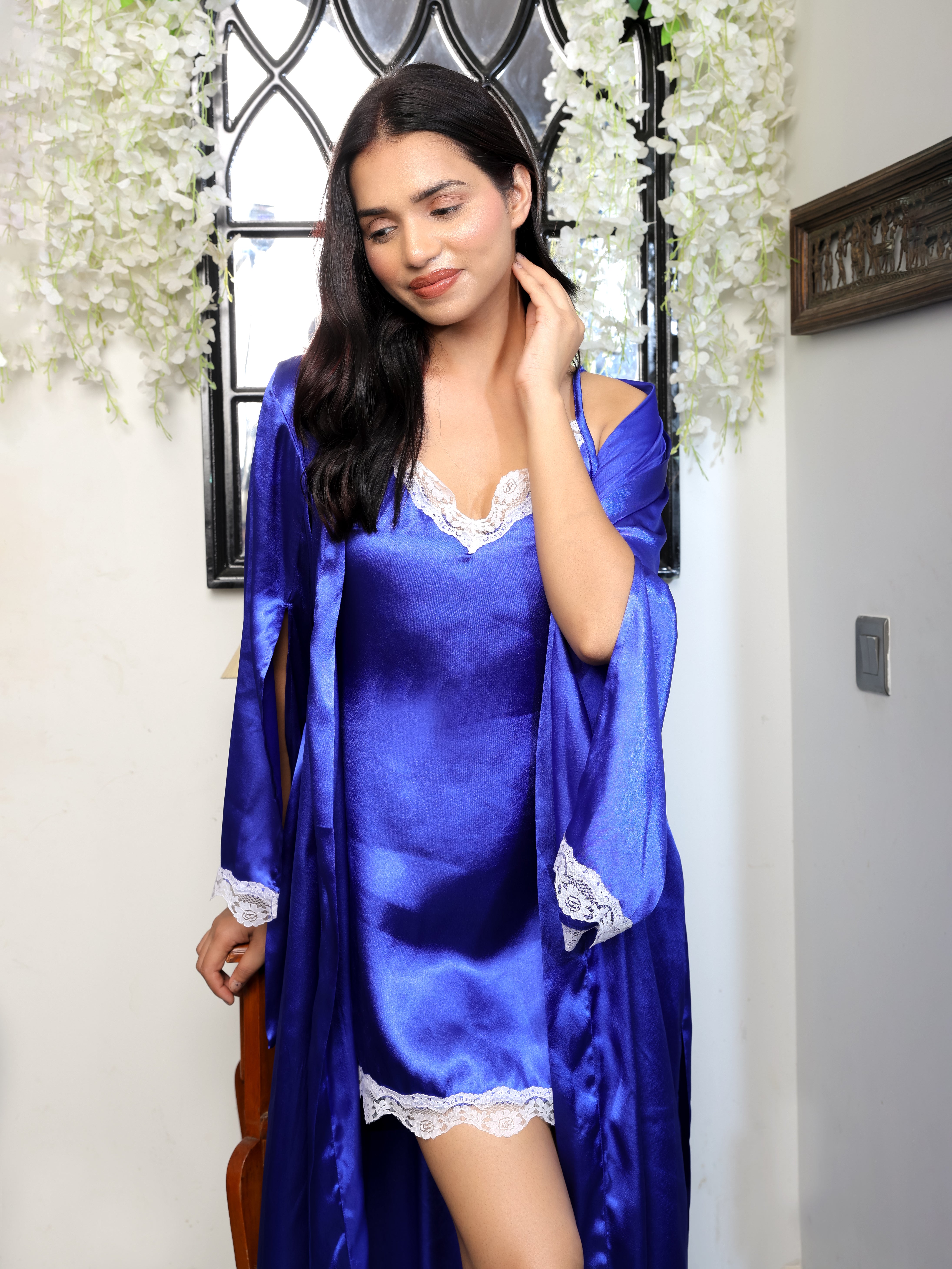 The serene royal blue hue adds a touch of sophistication, while the white lace detailing enhances its feminine charm. Lightweight and comfortable, this set is perfect for bridal wear, honeymoon nights, or simply unwinding in style.