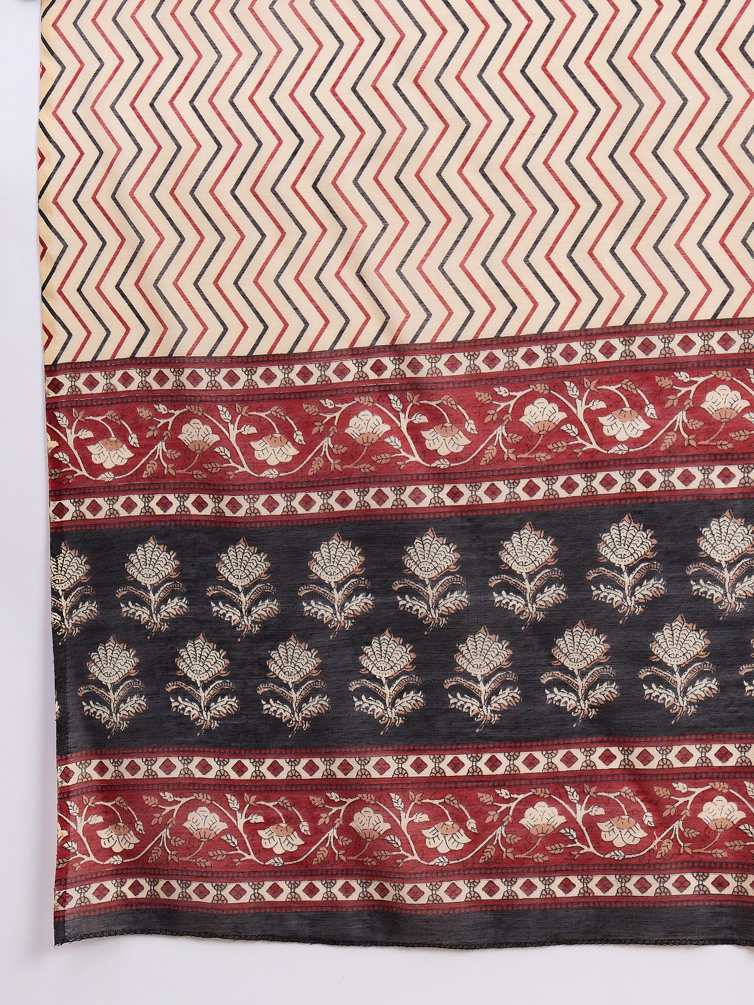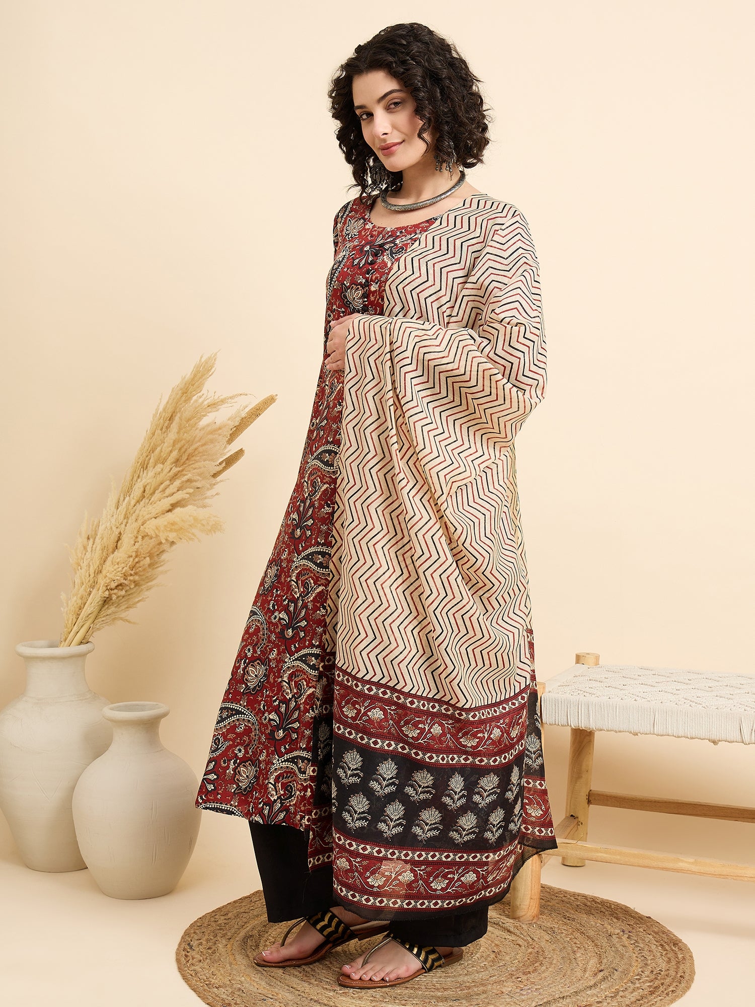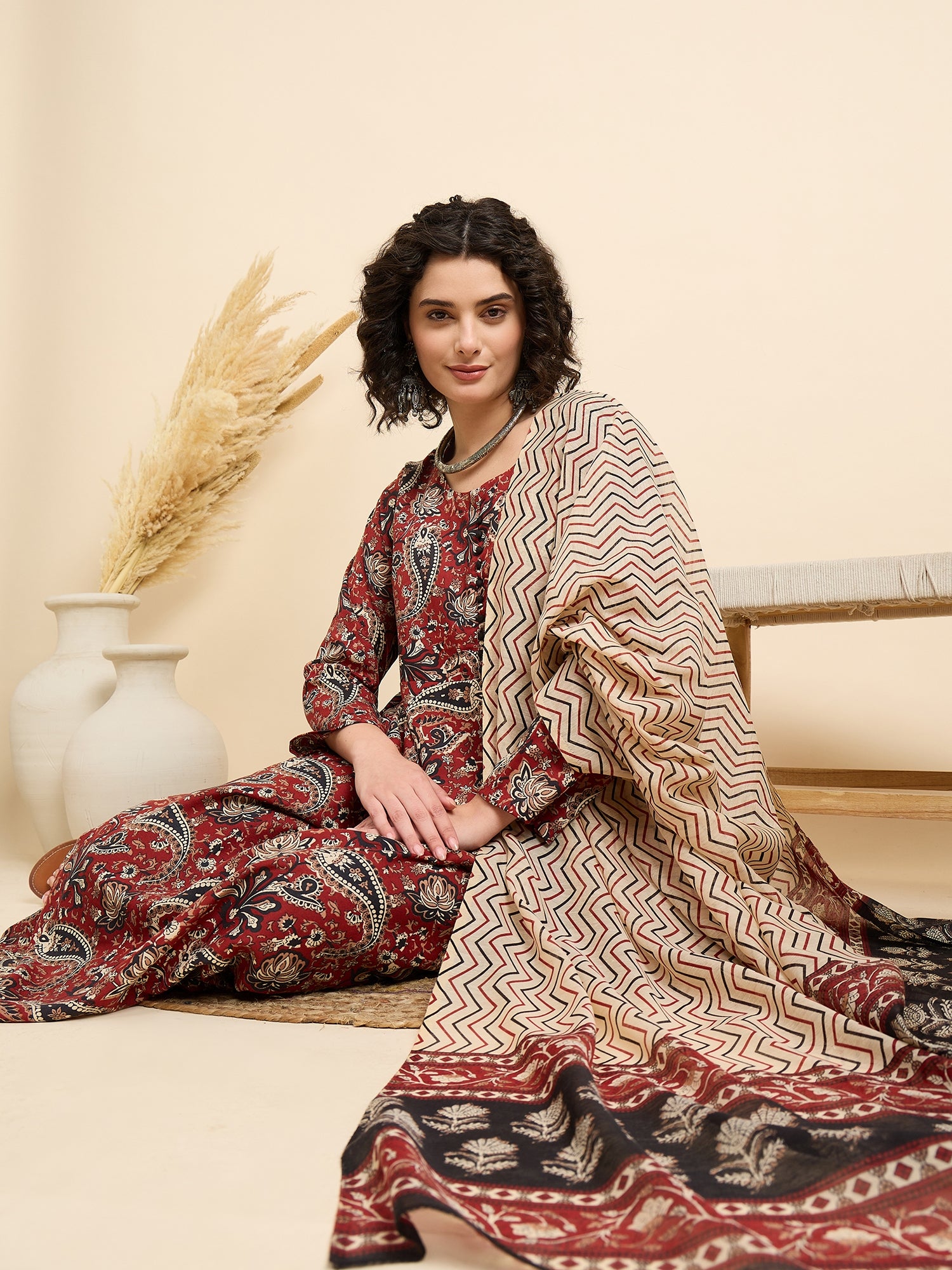 Celebrate timeless traditions with our Rudrangi Suit Set, a graceful combination of rich maroon hues and intricate paisley block prints. The flared kurta adds a flowy elegance, paired with contrasting black pants and a soft beige dupatta featuring chevron patterns with a detailed border. Perfect for festive occasions, family gatherings, or casual ethnic days, this set brings a touch of heritage charm to your wardrobe.