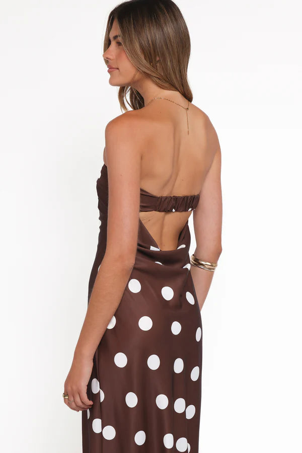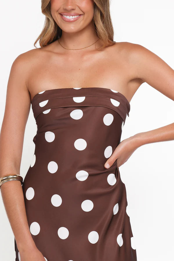Crafted from smooth satin-like fabric, this beautiful maxi dress features a rich chocolate brown base adorned with classic white polka dots, creating a sophisticated yet playful look. The strapless neckline highlights the shoulders and collarbone, while the flattering fitted bodice flows seamlessly into a graceful full-length silhouette.